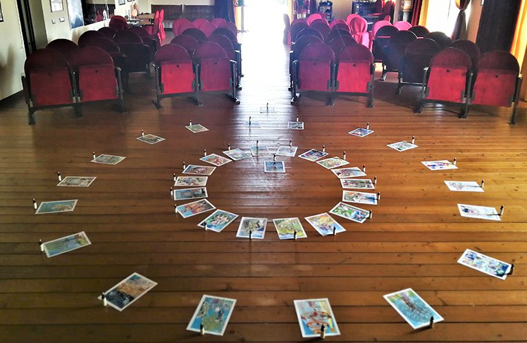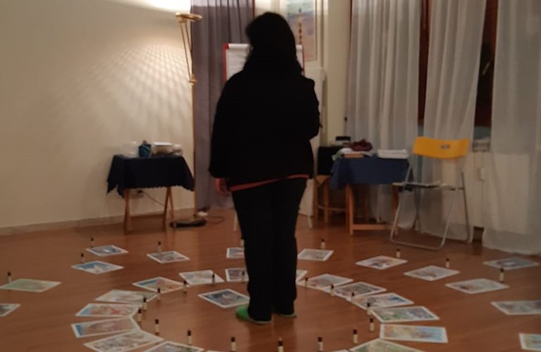 Le tavole e le essenze floreali disposte in cerchio a terra diventano sentieri di un Mandala ricco di colori e spunti narrativi, lungo i quali le persone camminano, alla scoperta di parti di Sé e della propria storia.